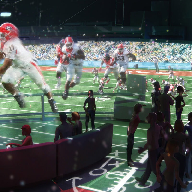No other system allows for massive groups of 100’s or even 1000’s of people in one location to participate in VR-like immersion without a headset